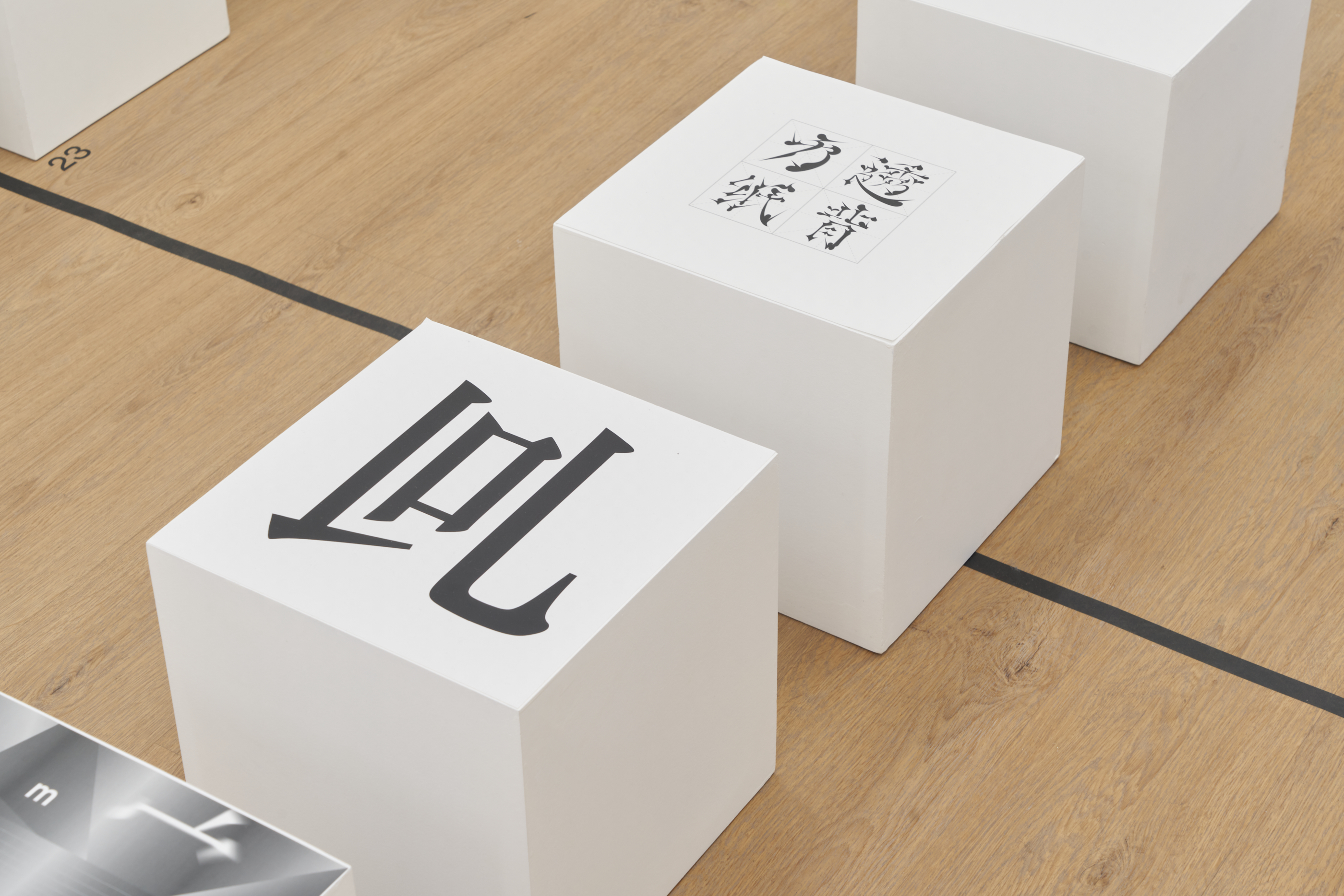 BU Art Galleries and IS A GALLERY work in parallel to place the works in conversation with one another through the curatorial plan and exhibition design—within each gallery and across the two countries and time zones. At BU Art Galleries the exhibition serves as an educational space displaying the works by the artists and the research that informed 回, the exhibition theme. The works are sequenced in conversation with one another—both complementary and at times contradictory—revealing a myriad of perspectives. Educational materials such as Chinese graphic design and typography books sit at the center of the gallery space on a square table, encouraging visitors to participate in the learning process. “Hosting the exhibition at an art gallery within a top research institution naturally created an opportunity to connect students in our BFA and MFA School of Visual Arts Graphic Design programs—as well as students at other universities—with leading professionals in the field,” says Yang.